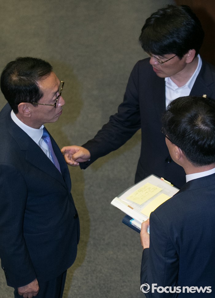 (서울=포커스뉴스) 19일 오전 서울 여의도 국회에서 열린 344회 국회(임시회) 1차 본회의, 사드(THAAD·고고도미사일방어체계) 배치에 대한 긴급현안질문에 참석한 김도읍(왼쪽) 새누리당 원내수석부대표와 박완주 더불어민주당 원내수석부대표가 대화하고 있다.