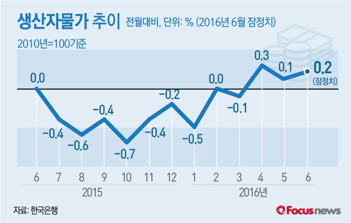 (서울=포커스뉴스) 한국은행이 19일 공개한 '2016년 6월 생산자물가지수'에 따르면 6월 생산자물가지수(2010년 100 기준)는 99.01로 5월 대비 0.2% 올랐다. 전년 동월 대비로는 2.7% 떨어졌다.