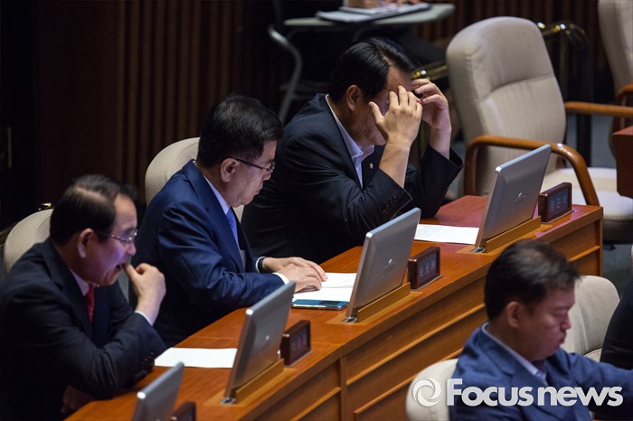 (서울=포커스뉴스) 새누리당 지도부가 19일 오전 서울 여의도 국회에서 열린 제344회 국회(임시회) 1차 본회의, 사드(THAAD, 고고도미사일방어체계) 배치에 대한 긴급현안질문에 참석 하고 있다. 왼쪽부터 박명재 새누리당 사무총장, 김광림 정책위의장, 정진석 원내대표.