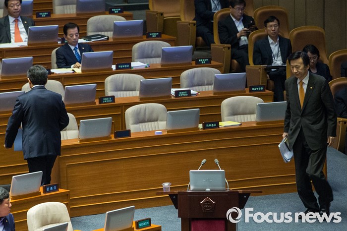 (서울=포커스뉴스) 윤병세(오른쪽) 외교부 장관이 19일 오전 서울 여의도 국회에서 열린 제344회 국회(임시회) 1차 본회의, 사드(THAAD, 고고도미사일방어체계) 배치에 대한 긴급현안질문에 참석해 의원 질의에 답하기 위해 연단으로 향하고 있다.
