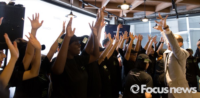 (서울=포커스뉴스) 19일 오전 서울 강남구 쉐이크쉑 강남점에서 열린 미디어 프리젠테이션 행사에서 랜디 가루티(왼쪽) CEO가 직원들과 쉑쉑박수를 치고 있다.