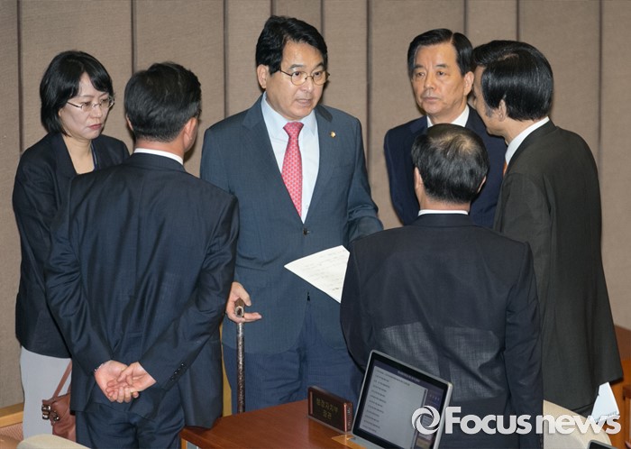 (서울=포커스뉴스) 19일 오전 서울 여의도 국회에서 344회 국회(임시회) 1차 본회의, 사드(THAAD·고고도미사일방어체계) 배치에 대한 긴급현안질문을 마친 뒤 심재철 국회 부의장과 한민구 국방부 장관, 윤병세 외교부 장관, 홍용표 통일부 장관 등이 대화하고 있다.