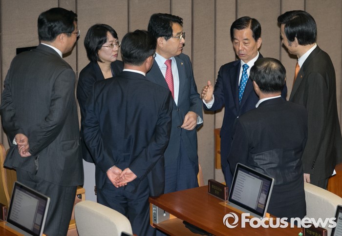 (서울=포커스뉴스) 19일 오전 서울 여의도 국회에서 344회 국회(임시회) 1차 본회의, 사드(THAAD·고고도미사일방어체계) 배치에 대한 긴급현안질문을 마친 뒤 심재철 국회 부의장과 한민구 국방부 장관, 윤병세 외교부 장관, 홍용표 통일부 장관, 주형환 산업통상자원부 장관 등이 대화하고 있다.