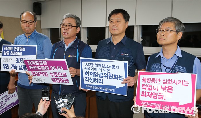 앞서 박대수 한국노총 상임부위원장, 김종인 민주노총 부위원장 등 최저임금위 근로자위원 9명 전원은 최저임금 결정 과정에 반발, 이날 국회에서 기자회견을 열고 위원직 사퇴를 선언했다.