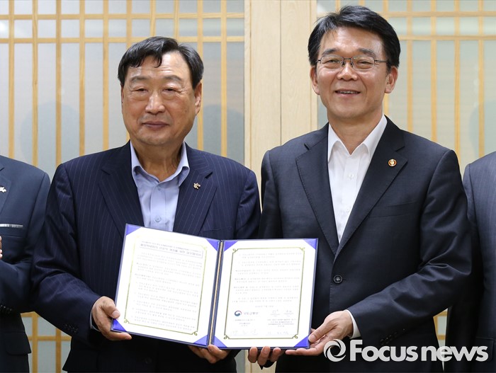 (세종=포커스뉴스) 강호인(오른쪽) 국토교통부장관이 19일 오후 세종시 정부세종청사 국토부 접견실에서 열린 평창동계올림픽 성공 개최를 위한 업무협약식에서 이희범 평창동계올림픽 조직위원장과 협약을 채결한 뒤 기념촬영하고 있다.