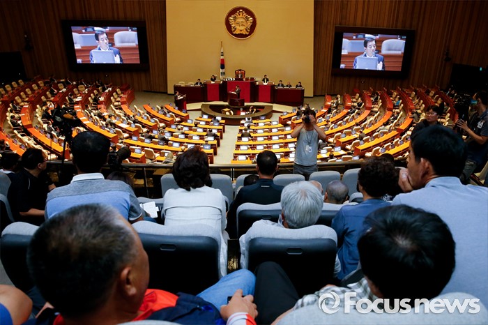 (서울=포커스뉴스) 19일 오후 서울 여의도 국회에서 열린 344회 국회(임시회) 1차 본회의, 사드(THAAD·고고도미사일방어체계) 배치에 대한 긴급현안질문에 참석한 성주군민 등 관계자들이 이완영 새누리당 의원이 한민구 국방부 장관에게 질문하고 있는 모습을 방청하고 있다.