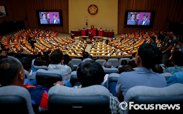 (서울=포커스뉴스) 19일 오후 서울 여의도 국회에서 열린 344회 국회(임시회) 1차 본회의, 사드(THAAD·고고도미사일방어체계) 배치에 대한 긴급현안질문에 참석한 성주군민 등 관계자들이 이완영 새누리당 의원이 한민구 국방부 장관에게 질문하고 있는 모습을 방청하고 있다.