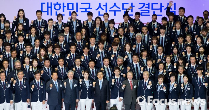 (서울=포커스뉴스) 19일 오후 서울 송파구 올림픽공원 올림픽홀에서 열린 2016 리우올림픽 대한민국 선수단 결단식에서 선수단이 기념촬영을 하고 있다.