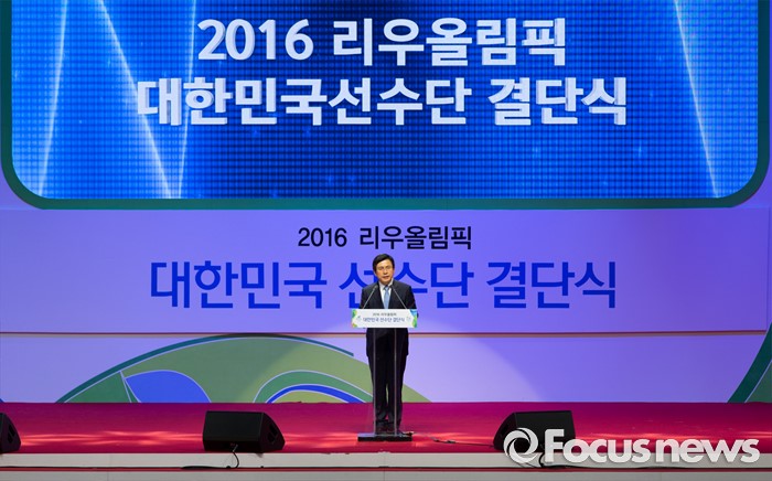 (서울=포커스뉴스) 19일 오후 서울 송파구 올림픽공원 올림픽홀에서 열린 2016 리우올림픽 대한민국 선수단 결단식에서 황교안 국무총리가 격려사를 하고 있다.