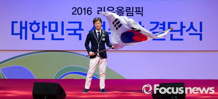 (서울=포커스뉴스) 19일 오후 서울 송파구 올림픽공원 올림픽홀에서 열린 2016 리우올림픽 대한민국 선수단 결단식에서 정몽규 대한민국 선수단장이 단기를 수여 받고 흔들어보이고 있다.
