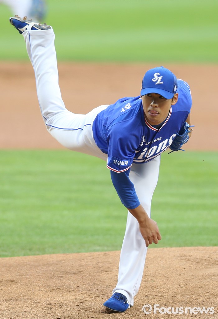 (서울=포커스뉴스) 19일 서울 잠실구장에서 열린 2016 프로야구 삼성-두산 경기에서 1회말 삼성 선발투수 윤성환이 투구하고 있다.