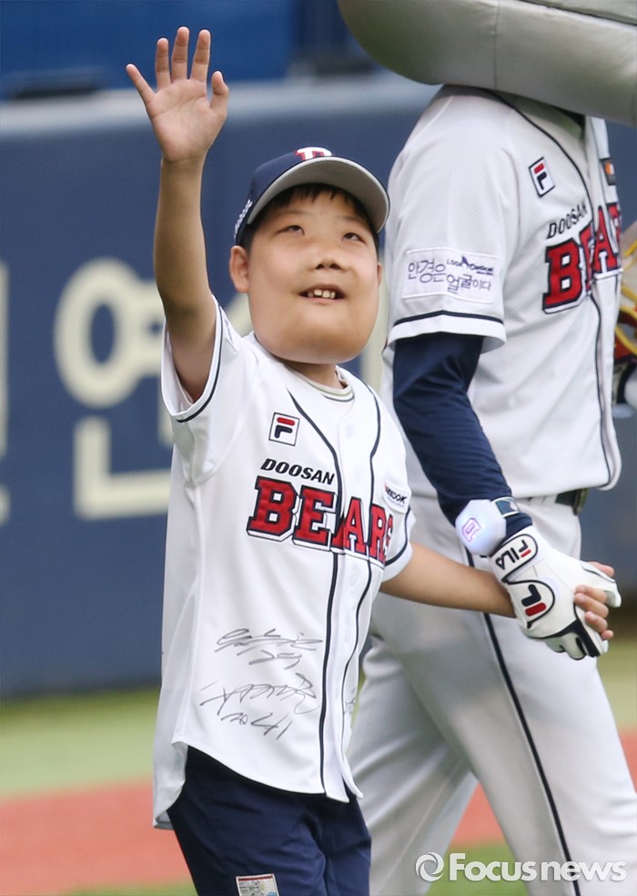 (서울=포커스뉴스) 19일 서울 잠실구장에서 열린 2016 프로야구 삼성-두산 경기에서 두산베어스의 '안면장애 청소년을 위한 소원성취 프로젝트'로 희귀 난치병인 세르비즘병을 앓고 있는 백우현(13세)이 시구를 위해 마운드로 올라가며 손울 흔들어 인사하고 있다.