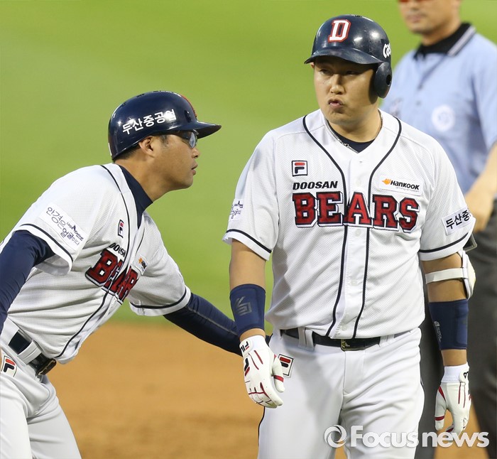 (서울=포커스뉴스) 19일 서울 잠실구장에서 열린 2016 프로야구 삼성두산 경기 4회말 1사 만루에서 두산 양의지가 중견수 희생플라이로 선취 득점 주자를 불러 들이고 강동우 코치의 축하를 받고 있다.