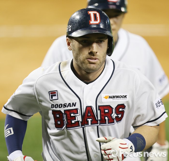 (서울=포커스뉴스) 19일 서울 잠실구장에서 열린 2016 프로야구 삼성-두산 경기 7회말 1사 1루에서 두산 에반스가 좌월 2점 홈런을 치고 홈인하고 있다.
