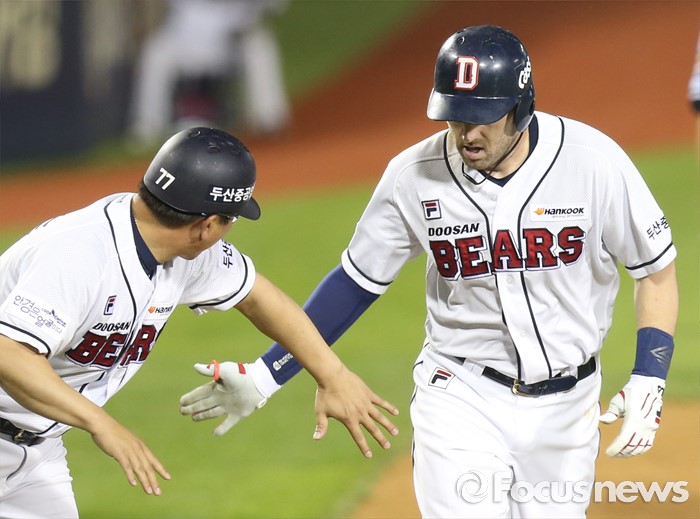 (서울=포커스뉴스) 19일 서울 잠실구장에서 열린 2016 프로야구 삼성-두산 경기 7회말 1사 1루에서 두산 에반스가 좌월 2점 홈런을 치고 3루를 돌며 전형도 코치의 한영을 받고 있다.