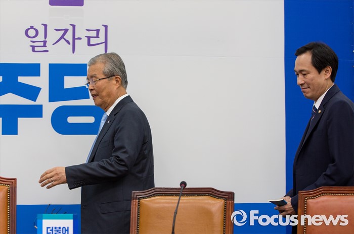 (서울=포커스뉴스) 김종인(왼쪽) 더불어민주당 비상대책위 대표와 우상호 원내대표가 20일 오전 서울 여의도 국회에서 열린 비상대책위원회의에 참석하기 위해 회의실로 들어서고 있다.