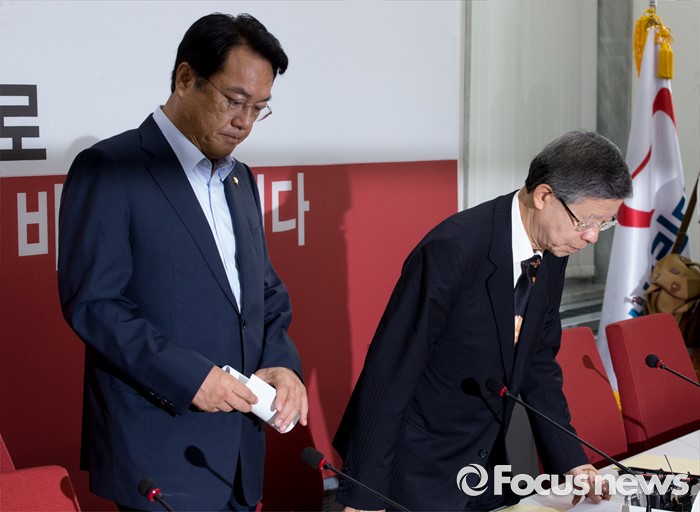 (서울=포커스뉴스) 20일 오전 서울 여의도 국회에서 열린 새누리당 혁신비상대책위원회의에 김희옥 위원장과 정진석 원내대표가 참석하고 있다.