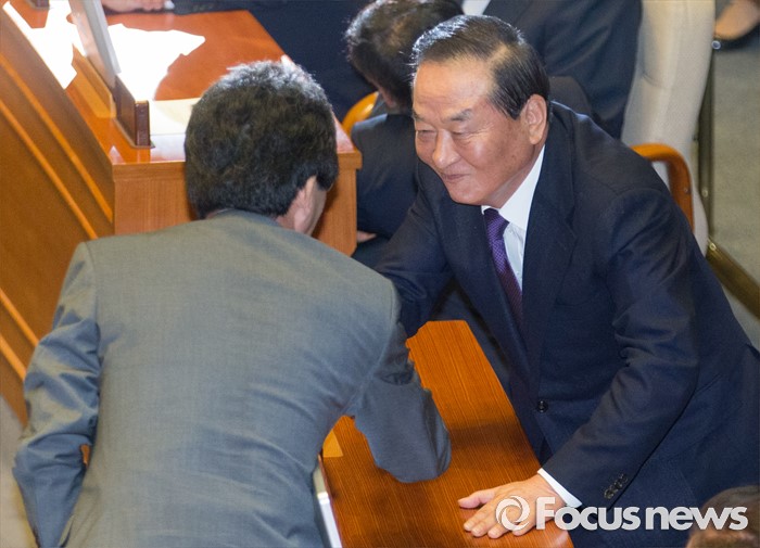 (서울=포커스뉴스) 20일 오전 서울 여의도 국회에서 열린 344회 국회(임시회) 2차 본회의, 사드(THAAD·고고도미사일방어체계) 배치에 대한 긴급현안질문에 참석한 서청원(오른쪽), 유승민 새누리당 의원이 인사하고 있다.