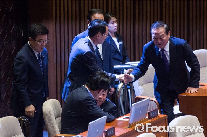 (서울=포커스뉴스) 새누리당 8.9 전당대회 불출마를 선언한 서청원(오른쪽) 의원이 20일 오전 서울 여의도 국회에서 열린 344회 국회(임시회) 2차 본회의, 사드(THAAD, 고고도미사일방어체계) 배치에 대한 긴급현항질문에 참석해 김도읍 원내수석부대표와 악수하고 있다.