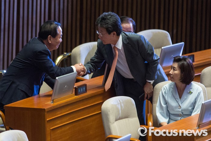 (서울=포커스뉴스) 새누리당 8.9 전당대회 불출마를 선언한 서청원(왼쪽) 의원이 20일 오전 서울 여의도 국회에서 열린 344회 국회(임시회) 2차 본회의, 사드(THAAD, 고고도미사일방어체계) 배치에 대한 긴급현항질문에 참석해 유승민(가운데) 의원과 악수하고 있다.