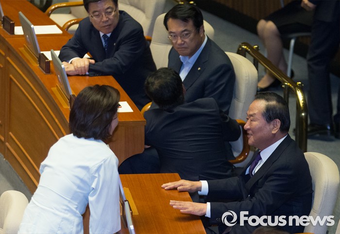 (서울=포커스뉴스) 20일 오전 서울 여의도 국회에서 열린 344회 국회(임시회) 2차 본회의, 사드(THAAD·고고도미사일방어체계) 배치에 대한 긴급현안질문에 참석한 서청원(오른쪽), 나경원 새누리당 의원이 대화하고 있다.