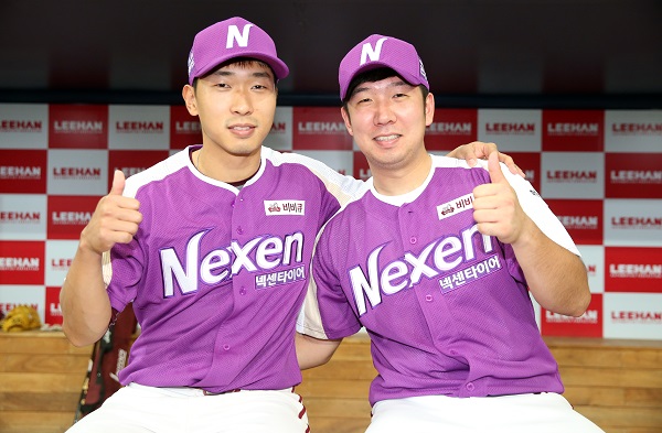 신재영, 김정훈, 김택형 사인회도 경기 전인 오후 5시부터 진행한다. 사인회 참가 번호표는 오후 4시30분부터 선착순 배포한다.넥센타이어데이 이벤트 유니폼을 입고 포즈를 취한 고종욱(왼쪽)과 신재영. <사진 제공=넥센히어로즈>