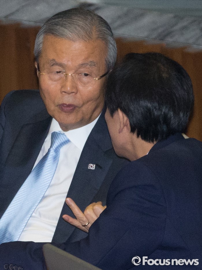 (서울=포커스뉴스) 20일 오전 서울 여의도 국회에서 열린 344회 국회(임시회) 2차 본회의, 사드(THAAD·고고도미사일방어체계) 배치에 대한 긴급현안질문에 참석한 김종인(왼쪽) 더불어민주당 비대위 대표와 우상호 원내대표가 대화하고 있다.