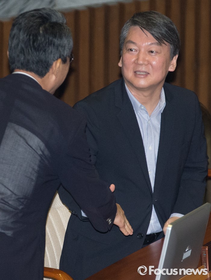(서울=포커스뉴스) 20일 오전 서울 여의도 국회에서 열린 344회 국회(임시회) 2차 본회의, 사드(THAAD·고고도미사일방어체계) 배치에 대한 긴급현안질문에 참석한 안철수(오른쪽) 국민의당 전 대표와 김성식 정책위의장이 인사하고 있다.