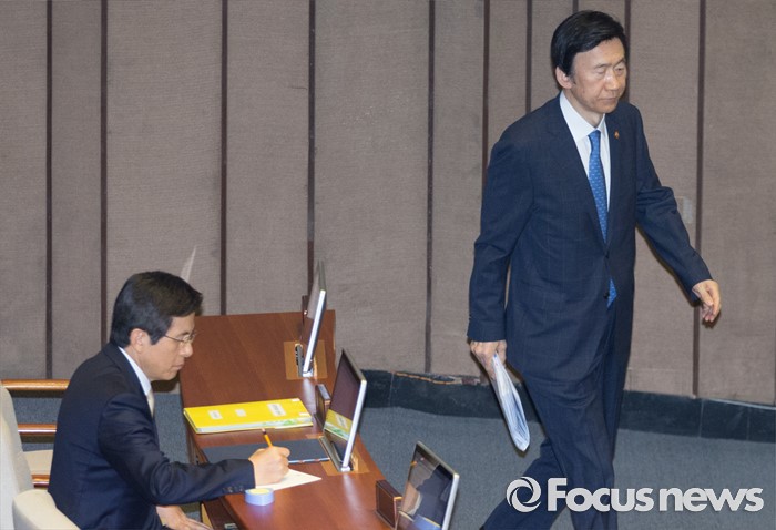 (서울=포커스뉴스) 20일 오전 서울 여의도 국회에서 열린 344회 국회(임시회) 2차 본회의, 사드(THAAD·고고도미사일방어체계) 배치에 대한 긴급현안질문에 참석한 윤병세 외교부 장관이 의원들의 질문에 대한 답변을 위해 단상으로 향하고 있다. 왼쪽은 황교안 국무총리.