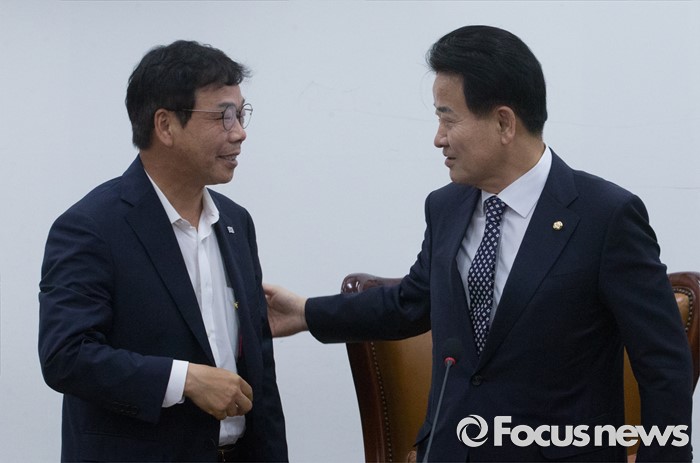 (서울=포커스뉴스) 20일 오전 서울 여의도 국회에서 열린 미래일자리 특별위원회 전체회의에 참석한 정동영(오른쪽) 위원장과 이완영 새누리당 간사가 대화하고 있다.