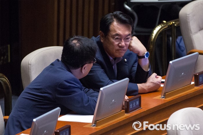 (서울=포커스뉴스) 정진석(오른쪽) 새누리당 원내대표와 김광림 정책위의장이 20일 오전 서울 여의도 국회에서 열린 344회 국회(임시회) 2차 본회의, 사드(THAAD, 고고도미사일방어체계) 배치에 대한 긴급현안질문에 참석해 대화 하고 있다.
