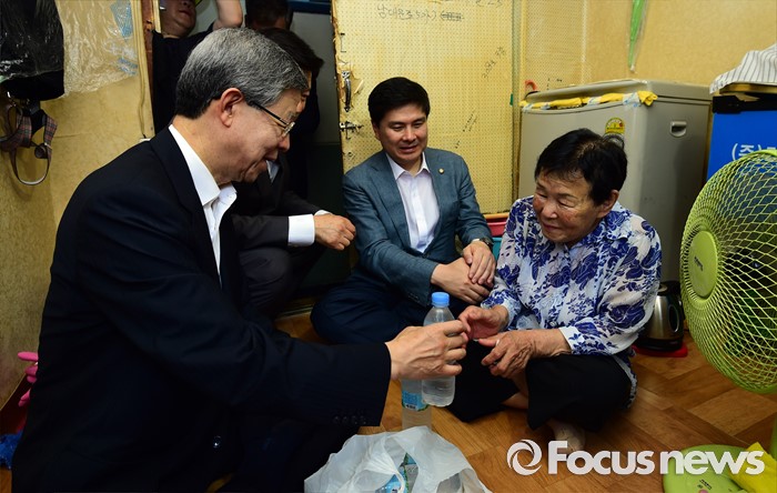 (서울=포커스뉴스) 김희옥(맨 왼쪽) 새누리당 혁신비대위원장이 20일 오전 서울 중구 남대문 쪽방촌을 방문, 주민들과 대화하고 있다.