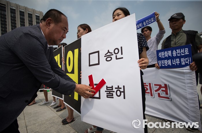(서울=포커스뉴스) 당진시 송전선로 석탄화력 저지 범시민대책위원회 관계자들과 환경단체 회원들이 20일 오전 서울 종로구 광화문 광장에서 당진 에코파워 석탄화력발전소에 대한 전원개발실시계획 승인 신청 반려를 촉구하는 퍼포먼스를 하고 있다.