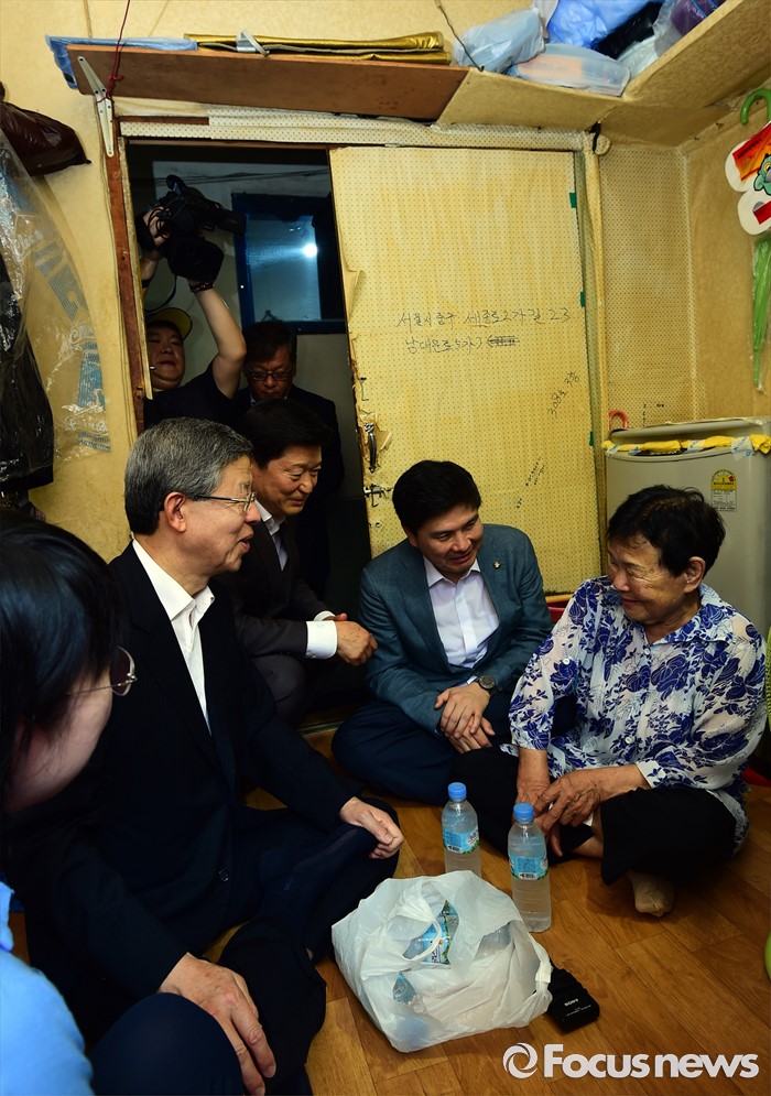 (서울=포커스뉴스) 김희옥(왼쪽 두번째) 새누리당 혁신비대위원장이 20일 오전 서울 중구 남대문 쪽방촌을 방문, 주민들과 대화하고 있다.