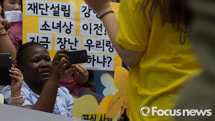 (서울=포커스뉴스) 20일 오후 서울 종로구 옛 일본대사관 앞에서 열린 제1240차 일본군 위안부 문제해결을 위한 정기 수요집회에 참석한 한 외국인이 사진촬영을 하고 있다.
