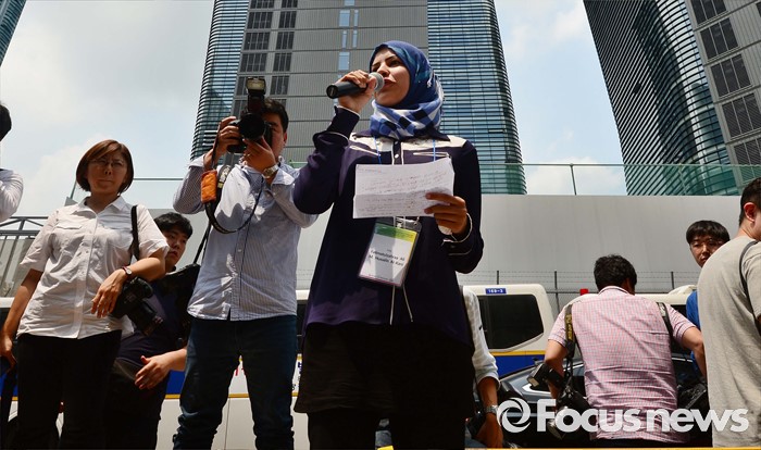 (서울=포커스뉴스) 20일 오후 서울 종로구 옛 일본대사관 앞에서 열린 제1240차 일본군 위안부 문제해결을 위한 정기 수요집회에서이화글로벌파워먼트 프로그램 참석중인 한 여성활동가가 자유발언을 하고 있다.