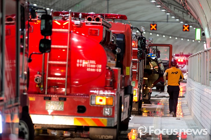 (서울=포커스뉴스) 20일 오후 서울 관악구 봉천터널 내에서 서초소방서, 방배경찰서 대원들이 강남순환도로 화재대응 유관기관 합동훈련을 하고 있다.