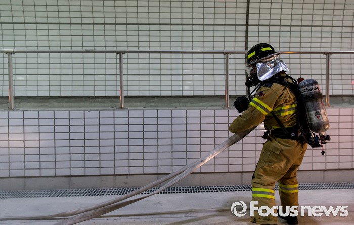 (서울=포커스뉴스) 20일 오후 서울 관악구 봉천터널 내에서 서초소방서, 방배경찰서 대원들이 강남순환도로 화재대응 유관기관 합동훈련을 하고 있다.