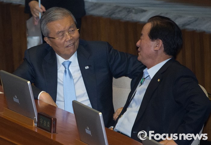 (서울=포커스뉴스) 20일 오후 서울 여의도 국회에서 열린 344회 국회(임시회) 2차 본회의, 사드(THAAD·고고도미사일방어체계) 배치에 대한 긴급현안질문에 참석한 정갑윤(오른쪽) 새누리당 의원과 김종인 더불어민주당 비대위 대표가 대화하고 있다.