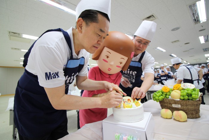 | △ 하이트진로가 창립 92돌 맞아 김인규대표외 임직원이 소외계층을 위한 생일케이크를 만들고 있다.JPG |