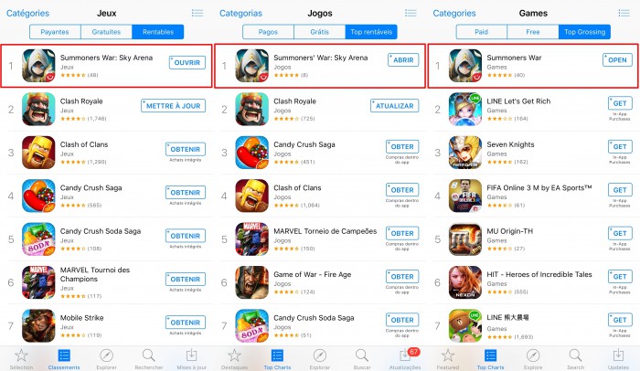 실제 서머너즈 워는 지난 18일 프랑스, 브라질, 태국, 필리핀, 베트남 등 총 5개 국가에서 애플 앱스토어 게임 매출 순위 정상에 올랐다. 특히 유럽과 남미시장의 주요 마켓 중 하나인 프랑스와 브라질 앱스토어에서 서머너즈 워는 전세계 출시 이후 처음으로 각 국가 게임 매출 1위를 달성했다.