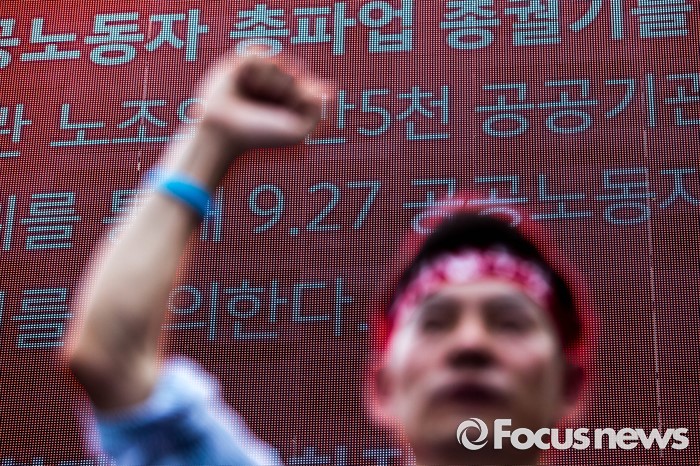 (서울=포커스뉴스) 20일 오후 서울 여의도 산업은행 앞에서 '민주노총 총파업 총력투쟁' 결의대회가 열리고 있다. 이번 결의대회에서 민노총 조합원들은 한상균 민노총 위원장 실형선고, 성과연봉제 등을 규탄했다.