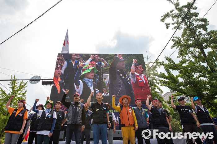 (서울=포커스뉴스) 20일 오후 서울 여의도 산업은행 앞에서 '민주노총 총파업 총력투쟁' 결의대회가 열리고 있다. 이번 결의대회에서 민노총 조합원들은 한상균 민노총 위원장 실형선고, 성과연봉제 등을 규탄했다.