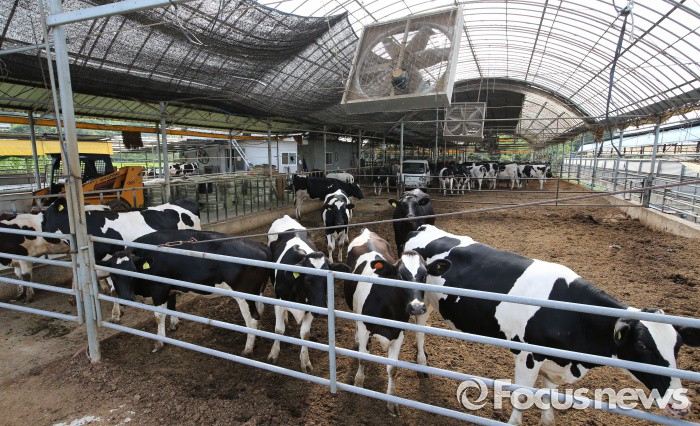 (세종=포커스뉴스) 폭염주의보가 발령된 20일 오후 세종시 한 농장에서 젖소들이 대형 선풍기 바람에 더위를 식히고 있다.