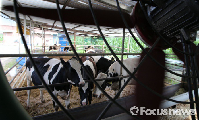 (세종=포커스뉴스) 폭염주의보가 발령된 20일 오후 세종시 한 농장에서 젖소들이 대형 선풍기 바람에 더위를 식히고 있다.
