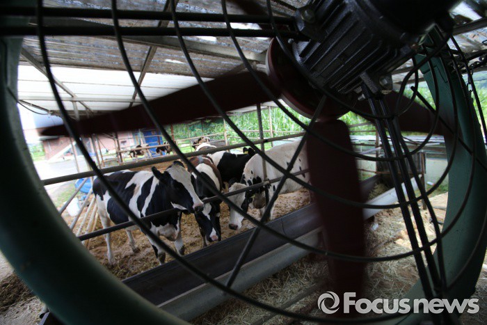 (세종=포커스뉴스) 폭염주의보가 발령된 20일 오후 세종시 한 농장에서 젖소들이 대형 선풍기 바람에 더위를 식히고 있다.