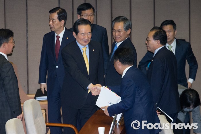 (서울=포커스뉴스) 20일 오후 서울 여의도 국회에서 344회 국회(임시회) 2차 본회의, 사드(THAAD·고고도미사일방어체계) 배치에 대한 긴급현안질문이 산회된 후 정세균 국회의장과 한민구 국방부 장관 등 국무위원들이 인사하고 있다.