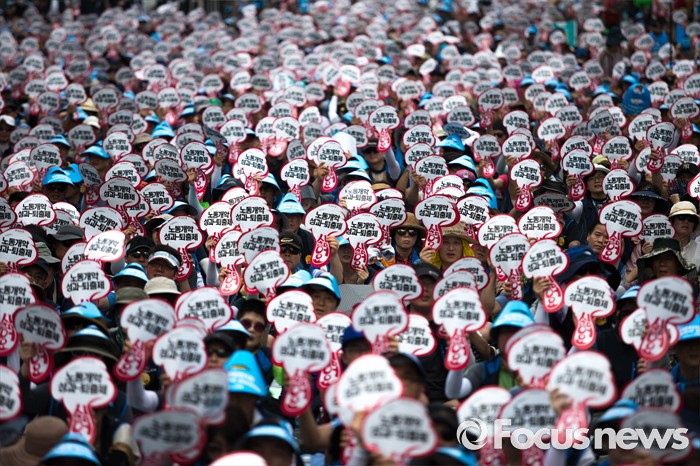 (서울=포커스뉴스) 전국민주노동조합총연맹(민주노총)이 정부의 반(反)노동정책 폐기, 최저임금 1만원, 한상균 민주노총 위원장 석방 등을 요구하고 나섰다.
