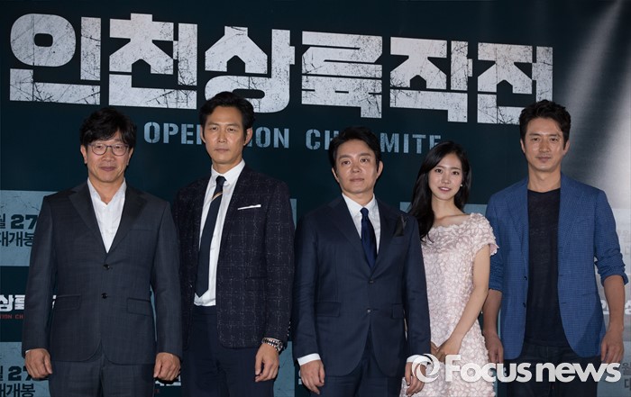 (서울=포커스뉴스) 20일 오후 서울 성동구 왕십리 CGV에서 열린 영화 '인천상륙작전' 언론시사회에 참석한 배우 박철민(왼쪽부터), 이정재, 이범수, 진세연, 정준호가 포토타임을 갖고 있다.