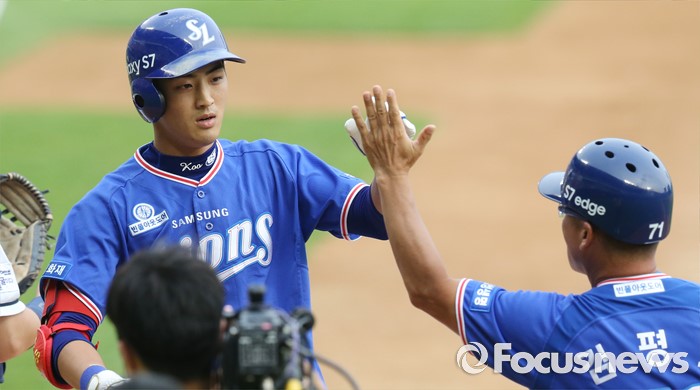 (서울=포커스뉴스) 20일 서울 잠실구장에서 열린 2016 프로야구 삼성-두산 경기 1회초 삼성 선두타자 구자욱이 좌츳 폴대를 맞히는 홈런을 치고 김평호 코치의 환영을 받으며 홈인하고 있다.